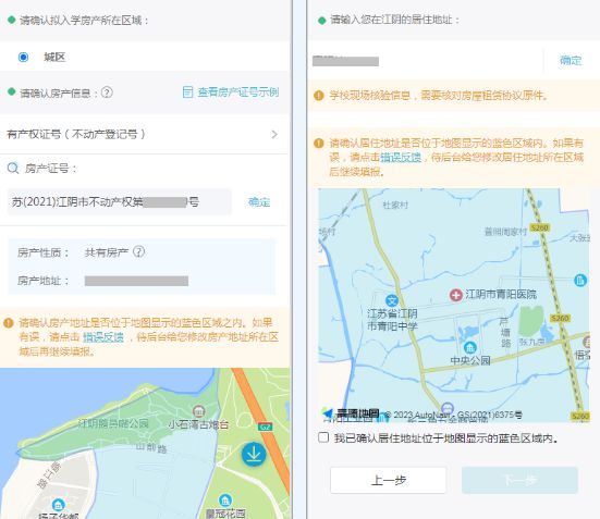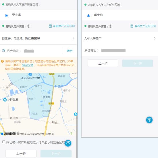 有房产时输入房产证号并确认房产地址是否位于蓝色区域之内;无房产时输入居住地址。