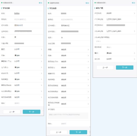 左图为学生其他信息填写页面(幼儿园),中图为学生其他信息填写页面(小学、初中),右图为新生户籍信息填写页面