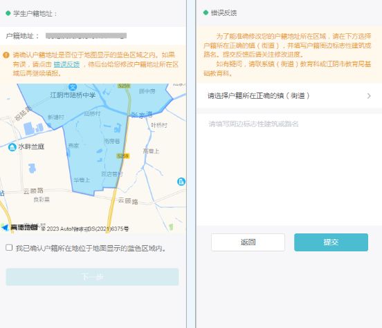 确认户籍地址位于地图显示的蓝色区域之内,确认无误勾选后进入【下一步】,如果有误,请点击【错误反馈】,待后台修改户籍地址所在区域后再继续填报。