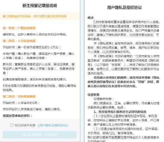 左图为填报说明页面,右图为用户隐私及授权协议页面