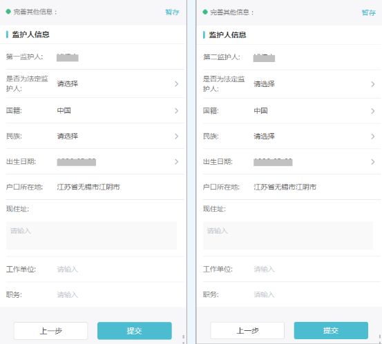 左图为监护人信息填写页面1,右图为监护人信息填写页面2