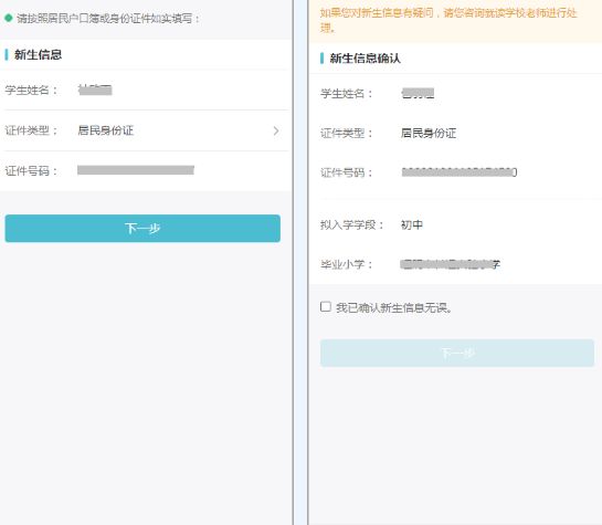 3. 点击【下一步】后再次确认新生的信息,包括基本信息和拟入学学段等信息。