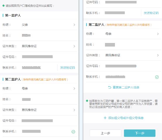 左图为第一监护人信息填写页面,右图为第二监护人信息填写页面