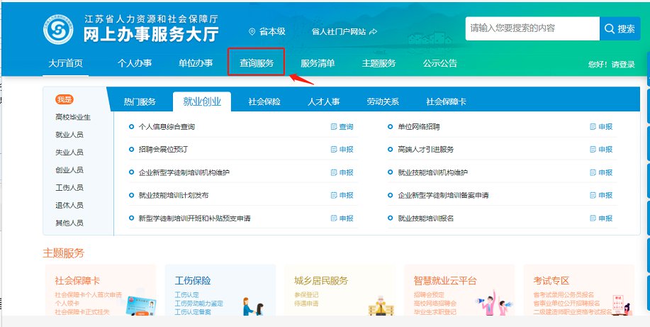 1、登录江苏人社网办大厅,找到“查询服务”